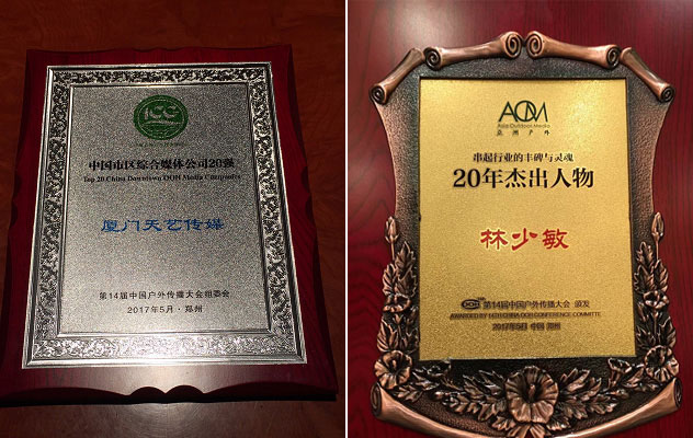 在剛剛落幕的第14屆中國戶外傳播大會上,廈門市天藝傳媒股份有限公司憑借20余年的媒體經營實力、誠信可靠的行業(yè)口碑及強大的市場占有率,在第六屆中國百強媒體評選中,從眾多優(yōu)質候選企業(yè)中脫穎而出,榮獲“中國市區(qū)綜合媒體公司20強”稱號。作為戶外廣告行業(yè)的標桿人物,天藝傳媒董事長林少敏被授予“20年杰出人物”榮譽稱號!